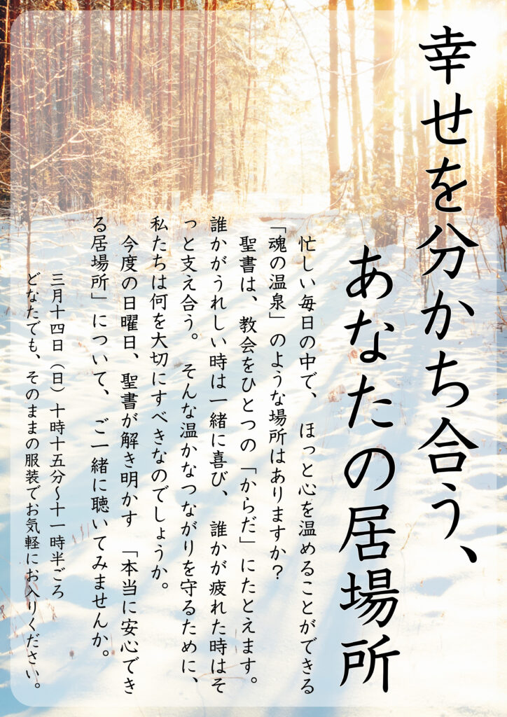 #居場所#幸せを分かち合う#魂の温泉#芦屋#芦屋福音教会#礼拝に行ってみよう#コミュニティ#心の安らぎ#聖書のことば#つながり