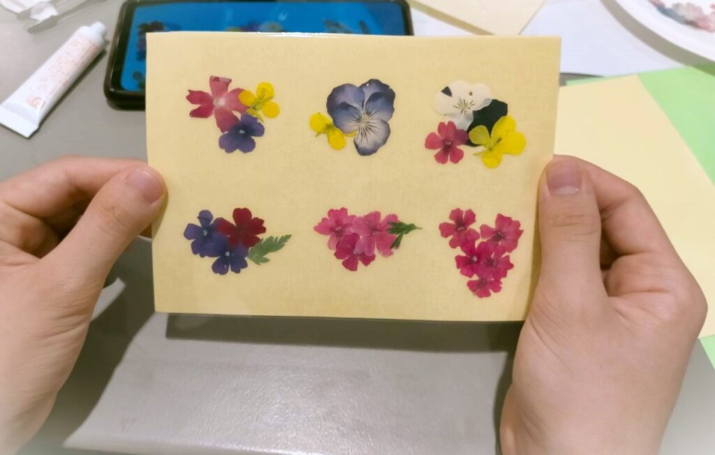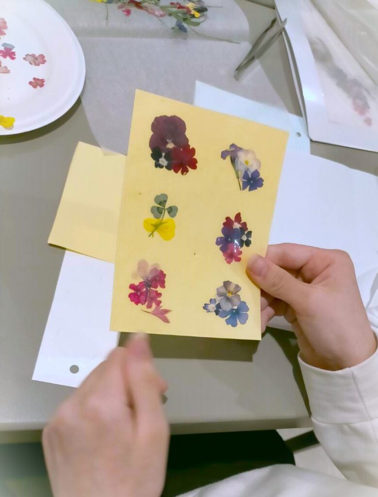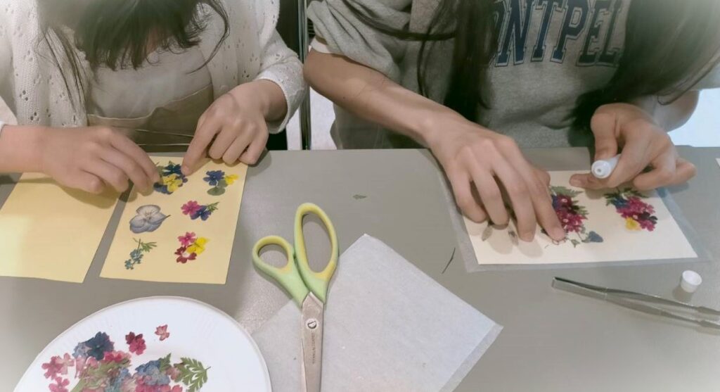 今回の「押花教室」では「涼やかな押花うちわ」を、「タディングレース編み」では「無料での体験」を予定しています。前回の押花教室では、「小学生から中高生、ご婦人やご高齢の方まで」ご参加下さり、押花シールとしおりを作りながらワイワイ楽しい時間を過ごしました。(前回の様子は下の写真をご覧下さい♪)年齢に制限はありませんので、小さなお子様からご高齢の方まで、気軽にお越し下さい。お待ちしています^^