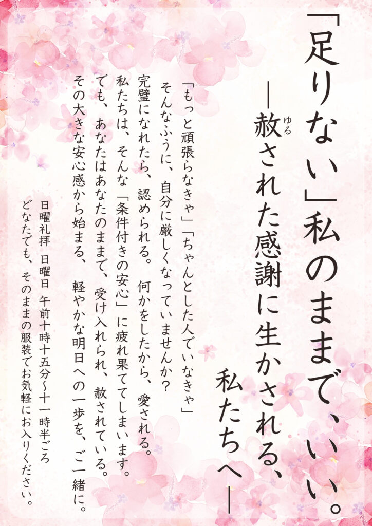 #西宮#神戸#阪神間#芦屋#打出#香櫨園#自己肯定感#自分を責めない#チャペル#癒やし#メンタルケア#心の休息#キリスト#赦し#無条件の愛#安心感#教会#魂の温泉#居場所#心の相談#呉川町#芦屋福音教会#生きるヒント#人生の悩み#人間関係の悩み#聖書#ルカの福音書#感謝#ありのままの自分