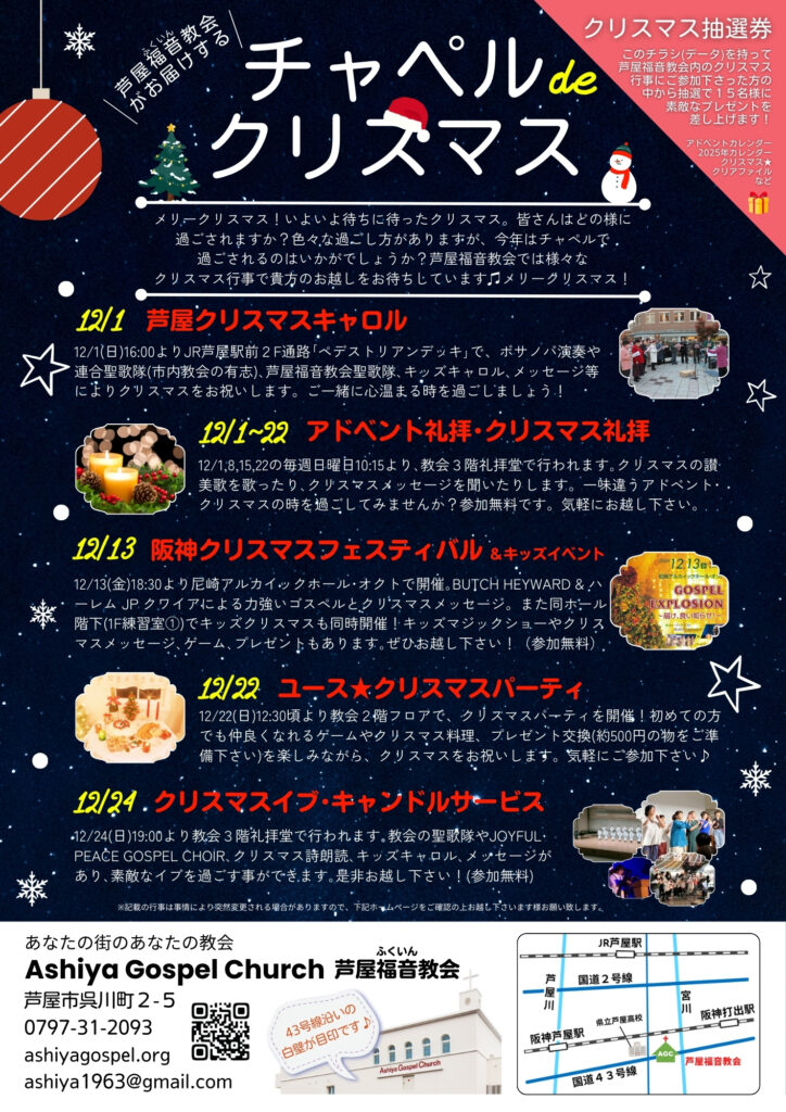 芦屋福音教会では、様々なイベントを通して貴方のお越しをお待ちしています。「クリスマスってそもそもどんな意味なんだろう?」「どうして教会もクリスマスをお祝いしているの?」「クリスマスは余り関係ないかな・・・」などなど、色々な思いで過ごされている事と思います。そもそもクリスマスとは教会ならではの行事で、教会こそ(!)お祝いをしています。クリスチャンではない方は「特に関係ない」と思われるかもしれませんが、そこには大切な意味が込められています。それは、「あなたは愛される為に産まれた人」だという事です。神様は貴方を愛している事を知らせる為に、御子キリストをこの地に送って下さいました。それがクリスマスのお祝いの始まりでした。