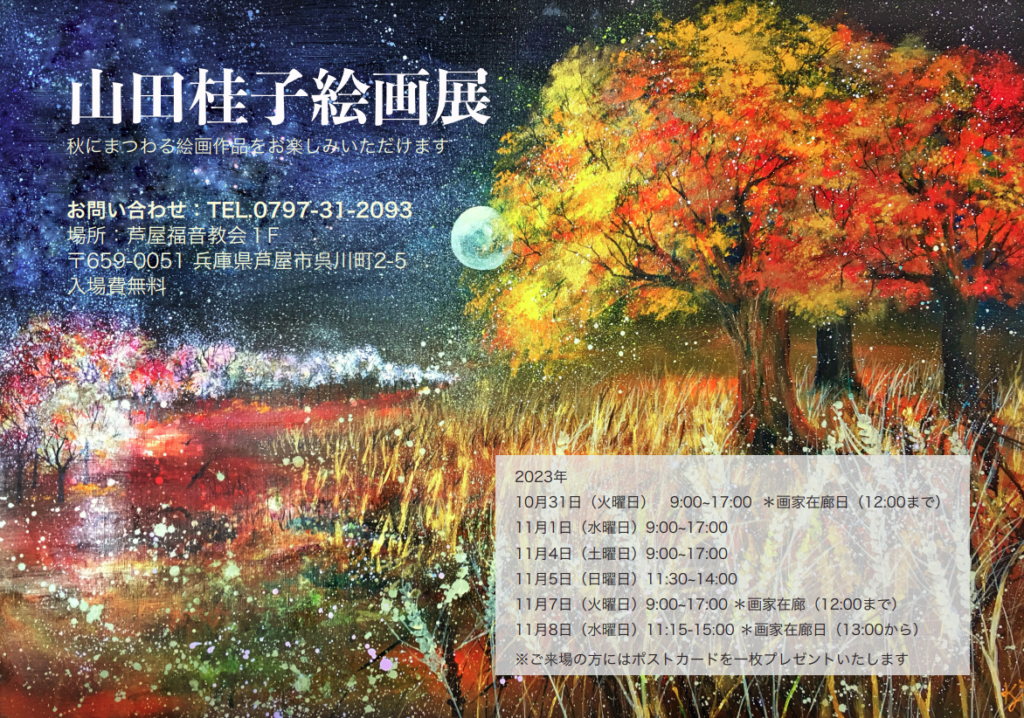 一時帰国中の山田桂子さんの絵画展が、教会堂1階ギャラリーで開催中です。どなたでもお入り頂けますので、気軽にお越し下さい。(開催日時は、下の案内をご覧下さい。)
