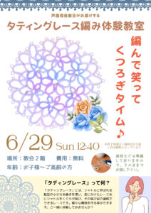 今月も「タディングレース編みの体験教室」を以下の通り行います! 日時:4月27日(日)12:40(約1時間程度を目安に、その後は自由参加です) 場所:芦屋福音教会2F(多目的ホール内) 費用:無料(材料の準備もあります […]