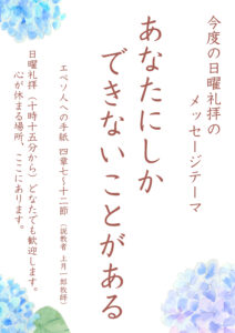 あなたは、なぜこの人生を生きているのだろう? あなたの性格も、経験も、出会いも、無意味なものなんて、一つもない。 あなたにしかできないことが、神様によって、必ず備えられている。 🌿今週の日曜礼拝 テーマは―― 「あなたに […]